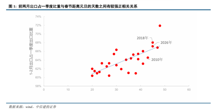 领先,本年春节“极晚”。2026年春节距离元旦天数高达46天,为2016年以来最高。历史教导标明,春节前夜出口企业倾向于集会发货,节后复工复产则需一定技术,因而春节时点越晚,1—2月出口限制越易被举高,开元棋牌官方网站入口3月出口相容许压;前两月出口占一季度比重与春节距元旦天数之间存在较彰着的正向关联。