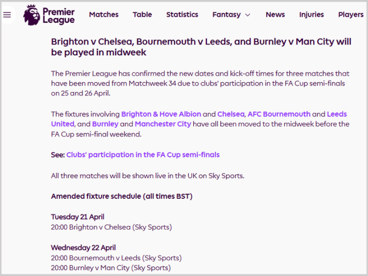 具体而言,足总杯半决赛安排在4月25日的周末举行,切尔西客场挑战布莱顿的联赛,改在4月21日进行,曼城客场挑战伯恩利,以及利兹联客场挑战伯恩茅斯,齐改在4月22日进行。