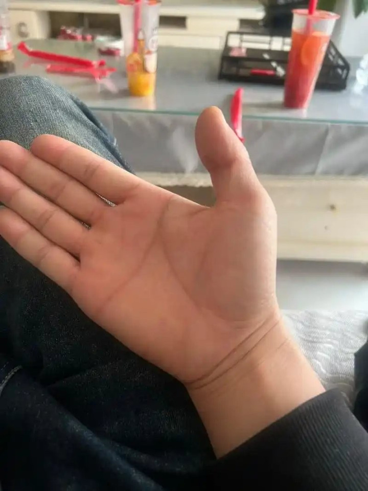 正常东谈主的手掌上有两条主纹,一条弯弯的情愫线,一条斜着走的人命线,两条各走各的路。断掌的情况是这两条线莫得分叉,径直合并成了一条,横着勾搭通盘这个词手掌,是以看起来超越精明。