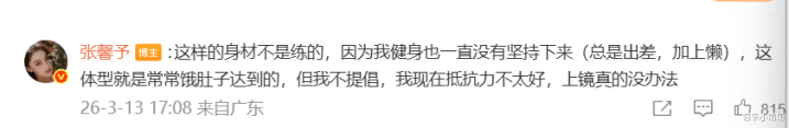 就在网友们纷纷爱慕张馨予好身体的时候,她却现身批驳区自曝好身体的真相是饿出来的,并不是练出来的,因为出差和懒的原因导致健身并莫得坚握下来,开云体育app但张馨予明确示意我方不淡薄这种饿出来的好身体,我方是因为上镜莫得方针,但现时的她违背力不太好。其实透彻不错交融张馨予,关于减肥的东说念主来讲,无论是坚握开通如故圮绝饮食,其实皆不是一件容易的事情。