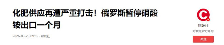 财联社:化肥供应再遭严重打击!俄罗斯暂停硝酸铵出口一个月