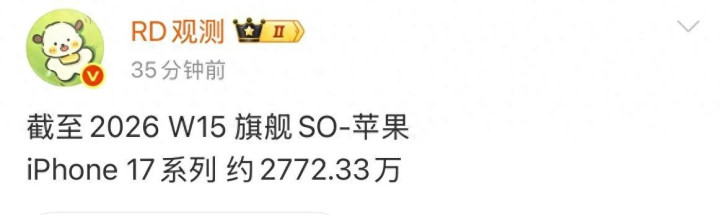字据“RD不雅测”的统计,落幕2026年第14周,iPhone 17系列在国内的累计销量达到了约2721.57万台。这个数据不仅让苹果稳坐同期销量冠军的宝座,更关键的是,它的增长势头一直很猛。