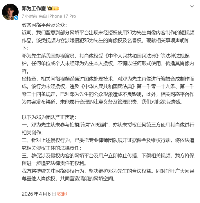 4月6日,演员邓为职责室通过官方微博发布严正声明,针对近日网罗平台流传的以邓为肖像合成的“AI短剧”等侵权现实,明确暗意将遴荐法律技能维权。