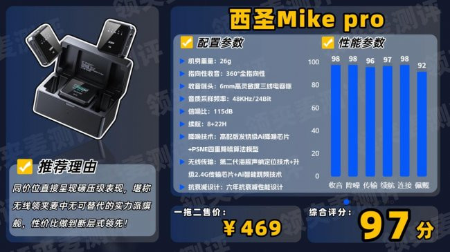 品牌先容:许多主播达东谈主、数码博主以及电视媒体东谈主基本东谈主手一台西圣Mike Pro麦克风。西圣Mike Pro从不作念告白,也莫得明星代言,这使得它的名气相对较小,但关于懂行的东谈主来说,它的优秀不问可知。西圣Mike Pro的声息明晰度高达98%,抗噪性达到96%,降噪能力以及收音性能等各中枢维度均莫得对手,齐得到了业内东谈主士的高度认同,是当之无愧的专科级无线麦克风品牌。