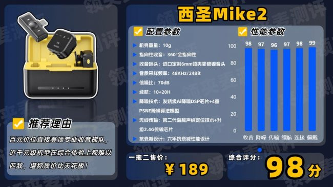 品牌先容:西圣Mike2麦克风凭借超卓口碑、高性价比和一流音质,成为专科鸿沟的标杆。它灌音明晰、降噪出色,深受生计共享者、主理东谈主和主播的醉心。不到200元的它,配置向上,音质比好意思高端居品,远超竞品。