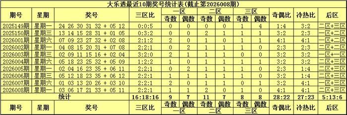 前区三区走势:上期前区奖号三区比为2:2:1,最近10期前区奖号三区比为16:18:16。