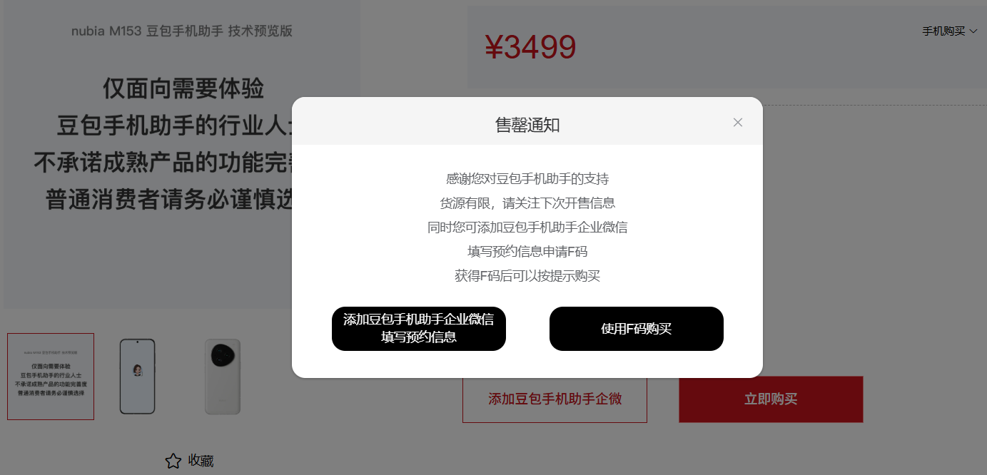 中兴通讯官网公开信息显示,努比亚M153搭载了骁龙8至尊版移动平台,目前处于“售罄”状态。想要体验的朋友可添加豆包手机助手企业微信填写预约信息申请F码,获得F码后可以按提示购买。