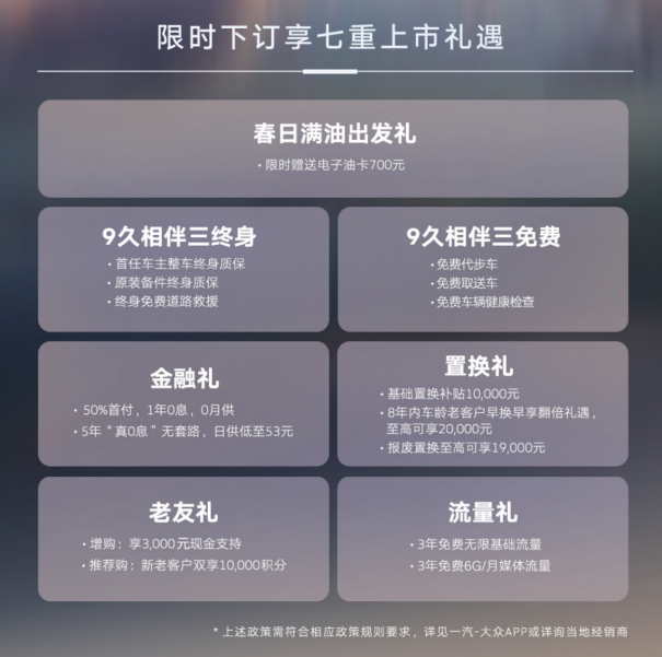 全新揽巡为用户带来由衷满满的限时七重上市礼遇,下订即送700元电子油卡,首任车主可享整车毕生质保、原装备件毕生质保、毕生免费谈路援助三项毕生保险,同期提供免费代步车、免费取送车、免费车辆健康搜检三项贴心做事,金融决策相沿50%首付1年0息0月供与5年真0息、日供低至53元,置换可享基础补贴10000元,8年内车龄老客户置换至高20000元,报废置换至高19000元,老车主增购享3000元现款相沿,保举购车新老客户双享10000积分,车辆还可享受3年免费无尽基础流量与3年每月6G媒体流量,全标的裁汰购车与用车门槛。