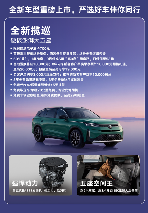 2026年春,一汽-公共以全新揽巡强势切入中大型五座SUV赛谈,主打“硬核倾盆”产物标签,专为嗜好探索生存的齐市东谈主群量身打造。新车提供450四驱至尊版与旗舰版,售价区间24.69万至26.69万元,并推出包含整车毕生质保、0息金融决策及高额置换补贴在内的七重礼遇。凭借2980mm轴距带来的广大座舱、第五代EA888发动机的7秒破百性能、IQ.Light矩阵大灯与IQ.Pilot智能驾驶系统,全新揽巡在缠绵、能源、智能与安全四大维度全面跨越,再行界说燃油SUV的高端体验鸿沟。