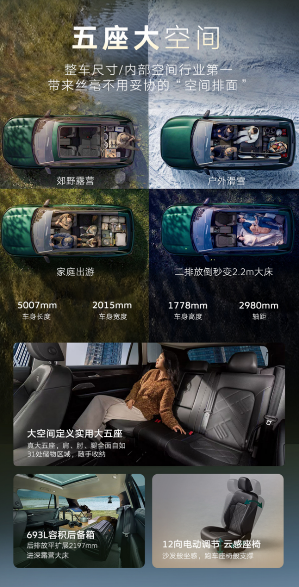 空间发扬是全新揽巡的中枢竞争力之一。依托超长轴距与超宽车体,新车打造出广大酣畅的大五座布局,后排腿部与横向空间充裕,乘坐无压抑感;693L超大后备箱相沿座椅比例放倒与底板高下治愈,空间天真拓展,可纵欲容纳露营装备、行李箱、儿童推车等物品;中控台下方、门板内侧、后备箱等处配备多处东谈主性化储物空间,骄贵小家庭浅近收纳需求,开云官方体育app兼顾酣畅与实用。