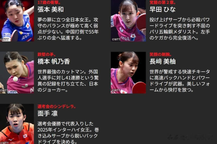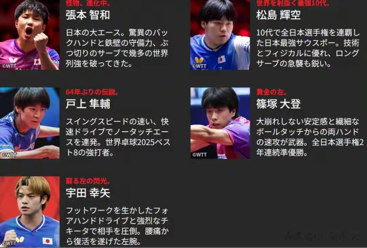 天然了,日本乒乓球这一次的伦敦世乒赛宣传片还不忘给我方脸上贴金,基本上给参预本次世乒赛的每一个日本队员都赋予了一个专属的荣誉称呼,具体如下: