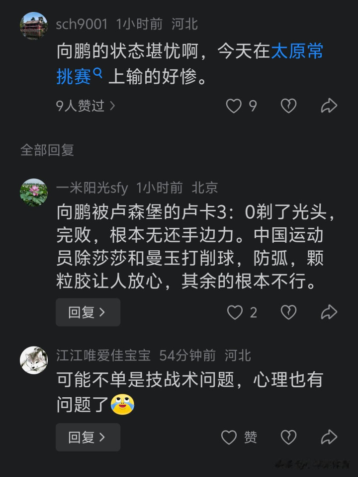 因为这场比赛向鹏的气象十分堪忧,而且输的罕见惨,被敌手3-0剃秃子了,这场比赛基本上被打的毫无还手之力,球迷们以为这不只单是技计策的问题,还有包括豪情方面的问题。